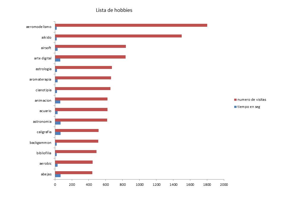 Se observa cómo el tiempo de visita de los hobbies más visitados a través de la Lista, es relativamente bajo, en casi todas ellas, como se ha señalado previamente, habiendo demostrado que el tiempo es más alto en los accesos directos al hobby.