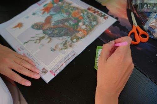 La pintura con diamantes (diamond painting) es una manualidad que consiste en realizar imágenes de color sobre un patrón determinado colocando pequeñas cuentas de colores.